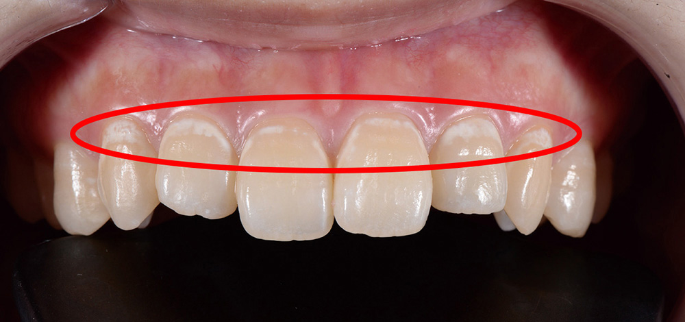 これは**「ホワイトスポット」**と呼ばれるもので、歯磨きでは取ることができず、長年コンプレックスに感じて大きく口を開けて笑えないという患者様も少なくありません。