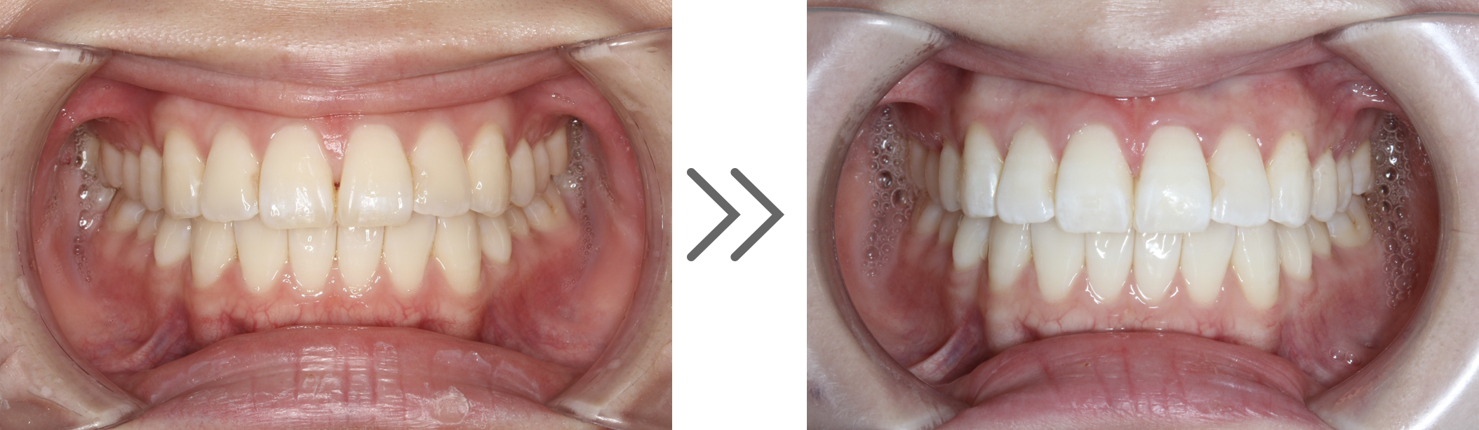 ホワイトニングをご希望の場合は「治療前」にアイコンで浸透させた樹脂(プラスチック素材)は、ホワイトニングのお薬では白くなりません。もしホワイトニングも検討されている場合は、先にホワイトニングで全体の歯の色を明るくしてから、 その色に合わせてアイコン治療を行うことを推奨しています。