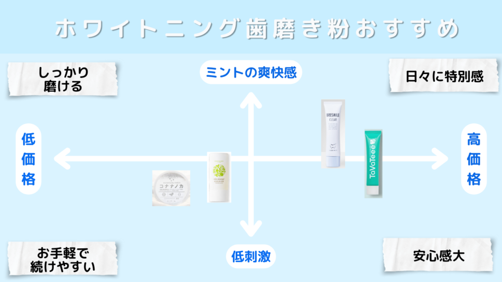 | ホワイトニング 歯磨き粉 | ![]() タヴァティー | ![]() ブレスマイルクリア | ![]() コナナノカ | ![]() はははのは |
